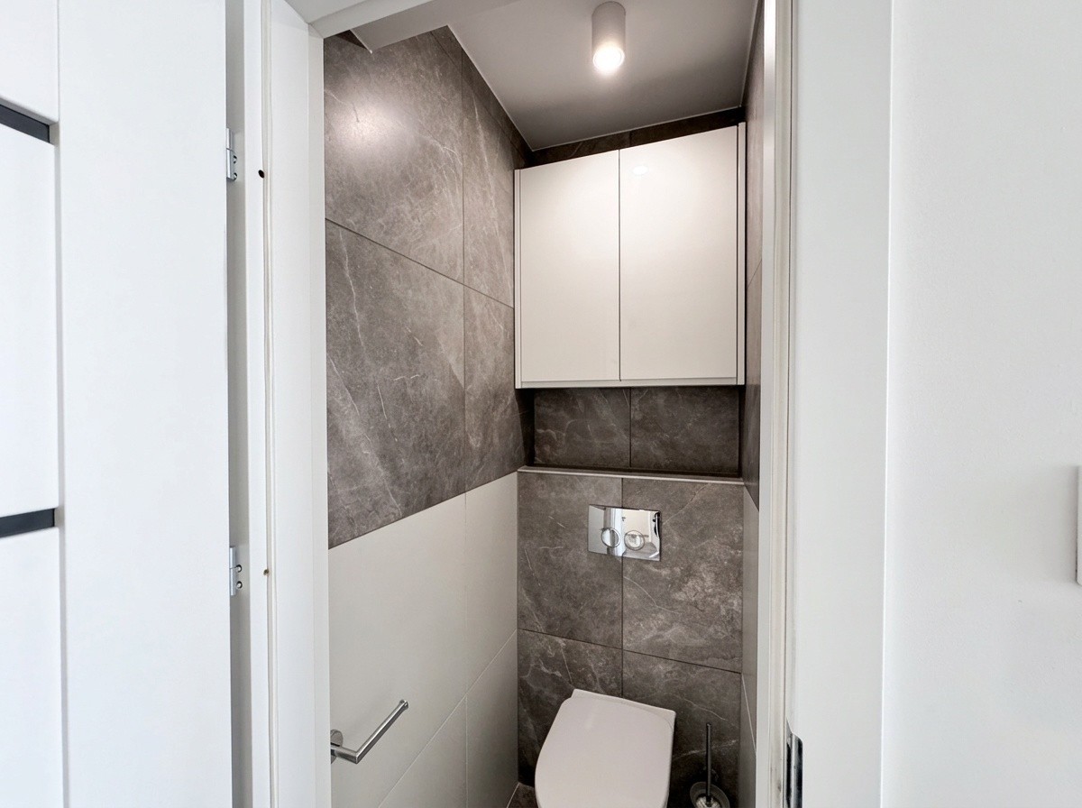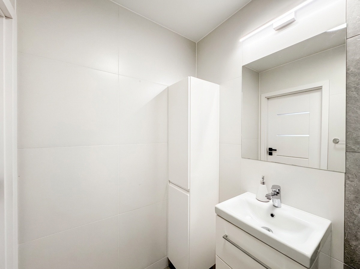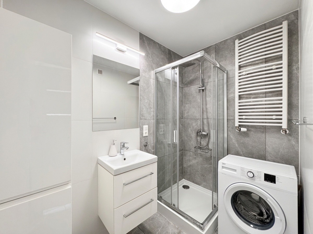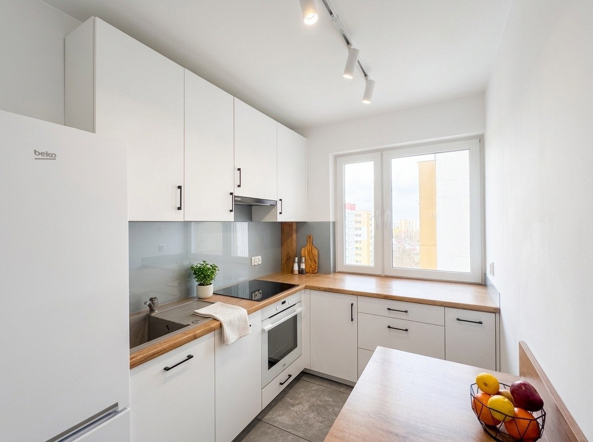 Lokal przeszedł gruntowny remont 2 lata temu. Zostały wymienione piony wodno-kanalizacyjne, instalacja elektryczna, okna na 3-szybowe oraz grzejniki. Kuchnia również posiada meble pod wymiar oraz pełne wyposażenie (piekarnik, płyta indukcyjna, pochłaniacz, lodówka, zmywarka). W sypialni umieszczono solidne łóżko wykonane przez stolarza oraz pojemną szafę. Łazienka oraz oddzielne WC zostały wykończone wielkoformatowymi płytkami imitującymi szary marmur. W salonie znajduje się narożnik, komoda, rozkładany stół z krzesłami zamknięty regał oraz szklany stolik. Całe widoczne wyposażenie pozostaje w cenie mieszkania.