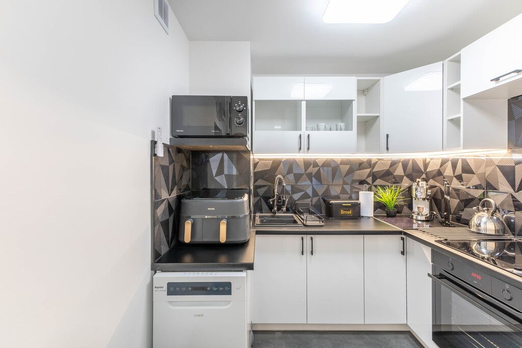 – Separate kitchen with full equipment: microwave, oven, hob, dishwasher, fridge, kettle, as well as a set of dishes and cutlery,