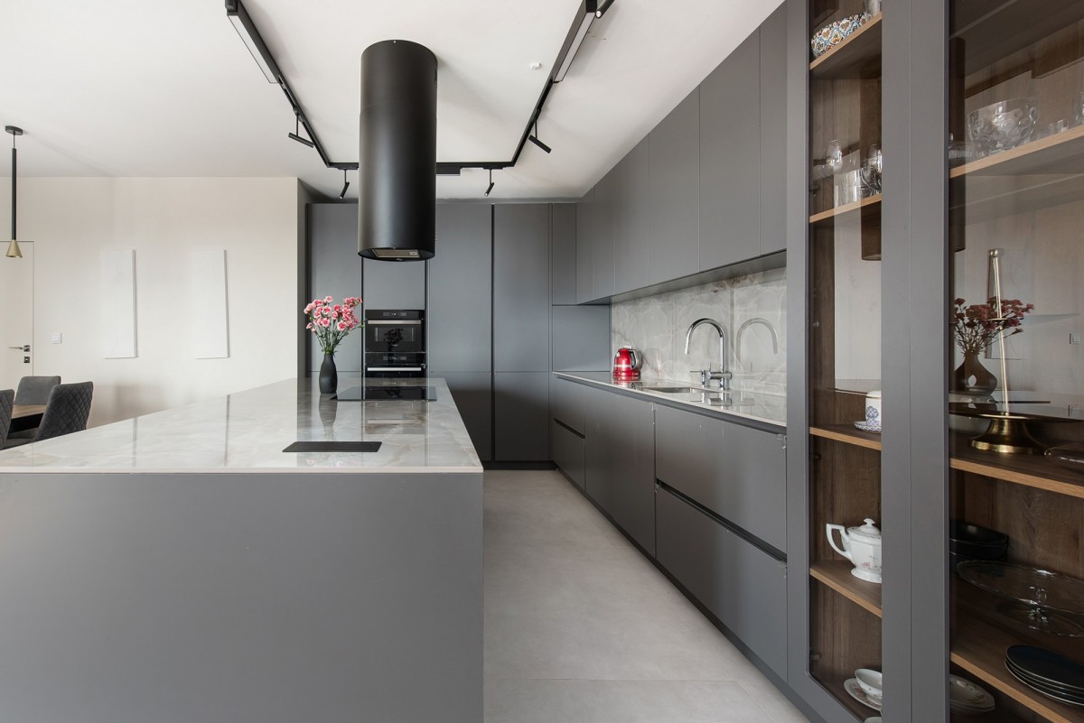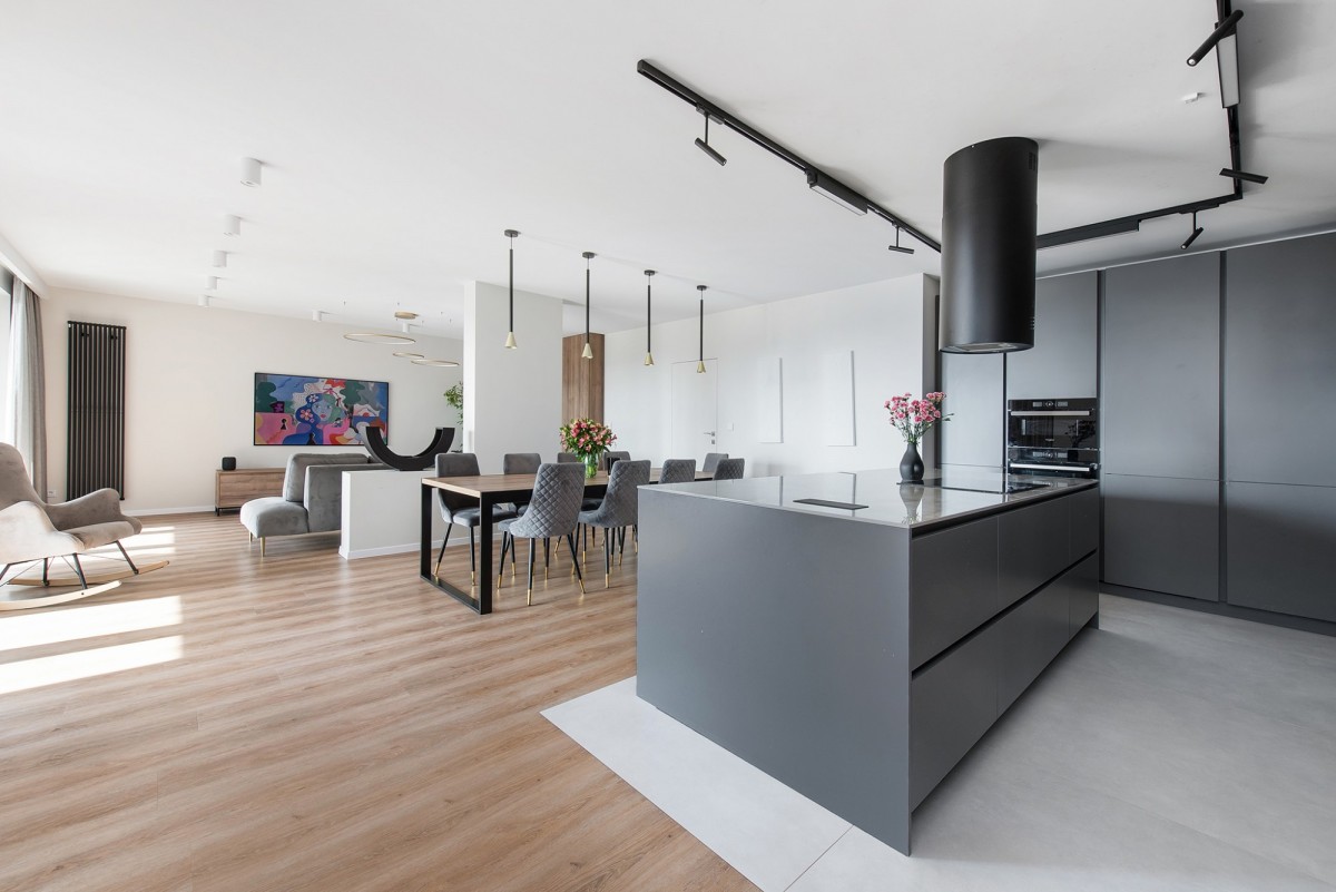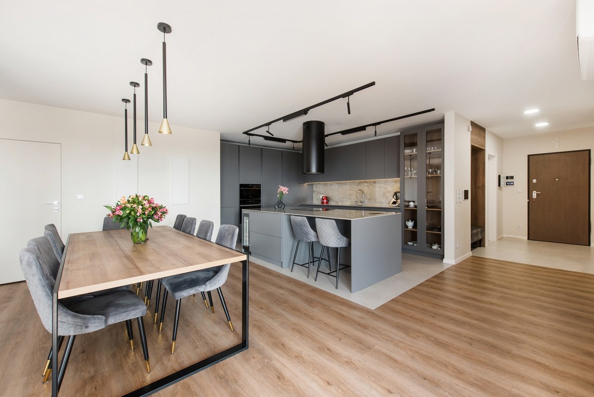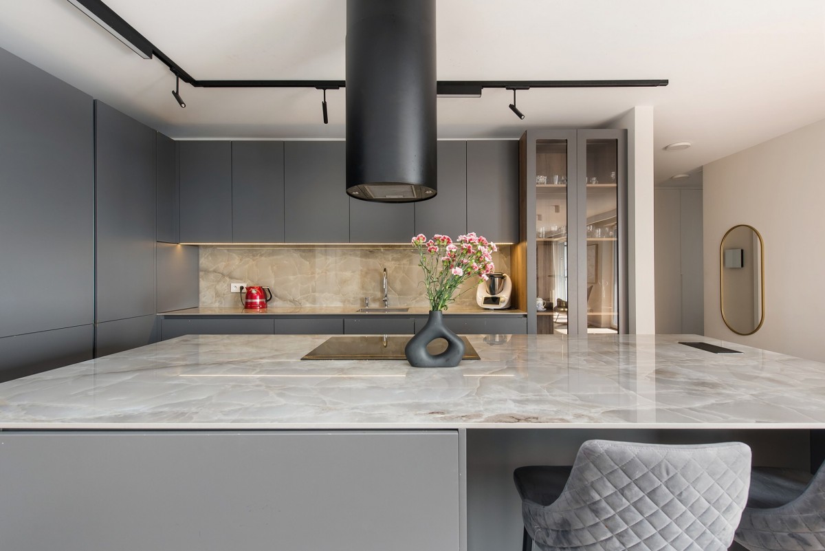 W kuchni zamontowano wysokiej klasy sprzęt agd, a także okap. Wyspa wykonana jest na zamówienie ze spieku. Hiszpańskie płytki w łazienkach – o niestandardowych wymiarach, robione na zamówienie.