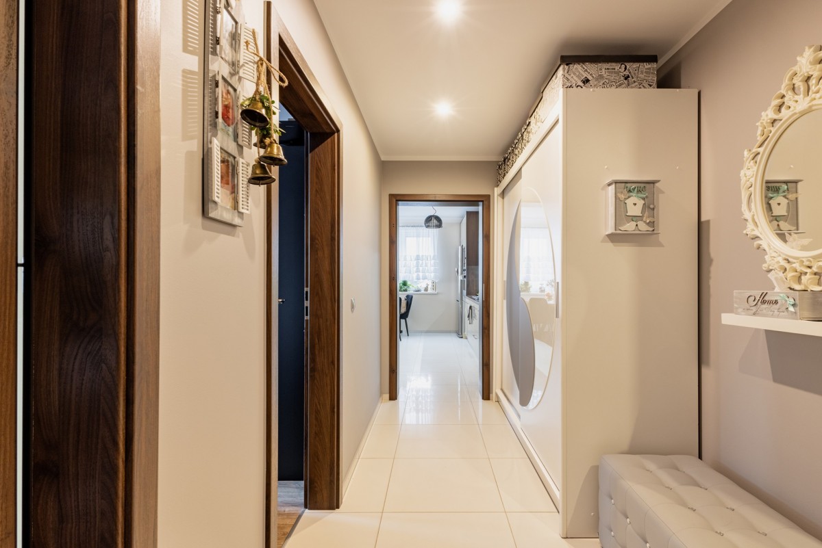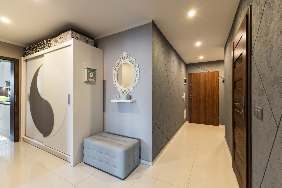 duży przedpokój z pojemną szafą w zabudowie oraz wydzieloną strefą garderobianą,