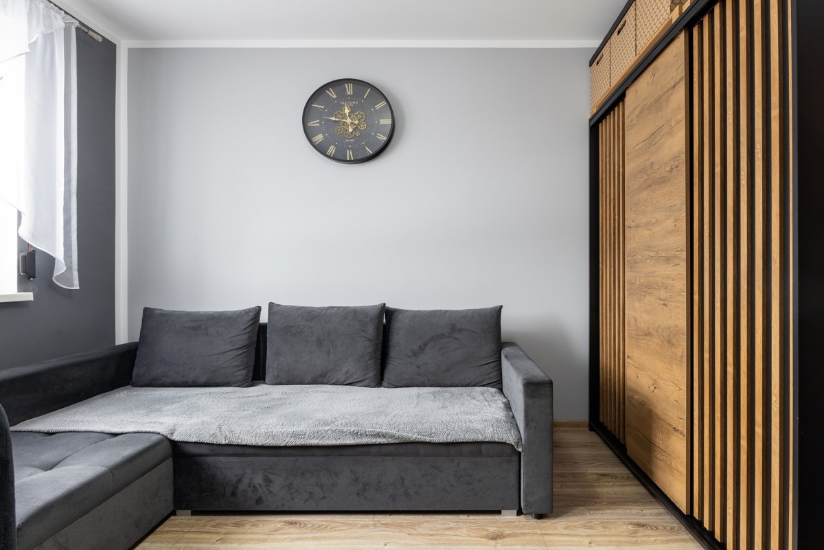 gipsowane ściany, malowane wysokiej jakości farbami zmywalnymi, w korytarzu świeżo wykonany tynk dekoracyjny – efekt betonu, panele w pokojach, płytki w strefach mokrych, sufit podwieszany GK w salonie, dodatkowe punkty świetlne i gniazdka, klimatyzowany salon z aneksem kuchennym, nowa zmywarka, częściowe umeblowanie: kuchnia, zabudowy stałe, szafy (meble ruchome – do uzgodnienia).