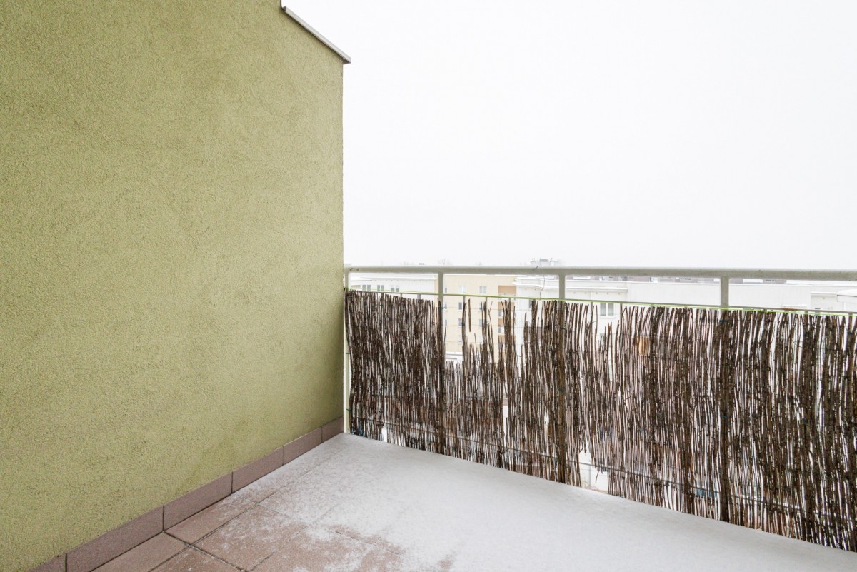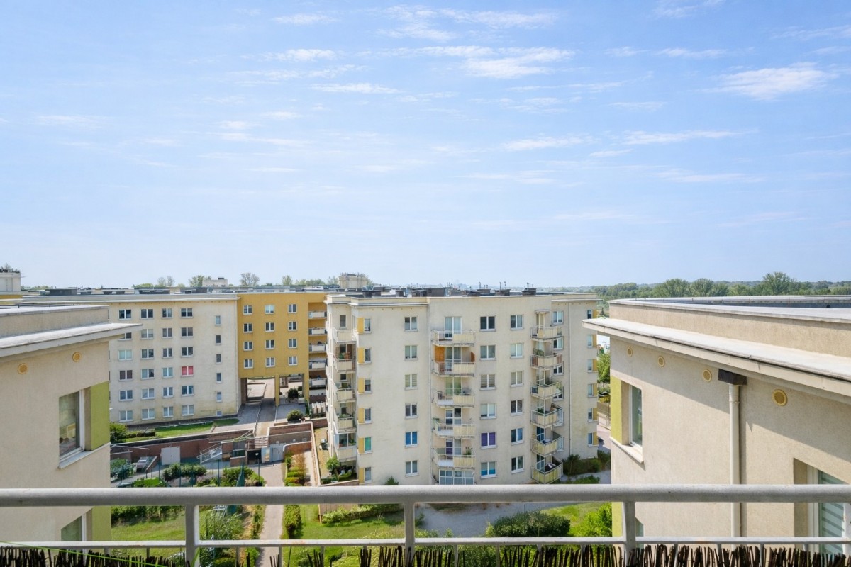 Z salonu prowadzi wyjście na balkon, z którego roztacza się widok na okoliczną zabudowę.