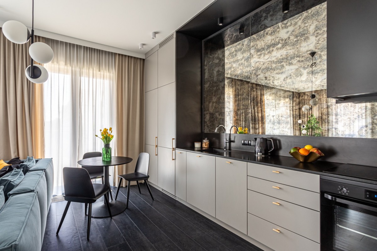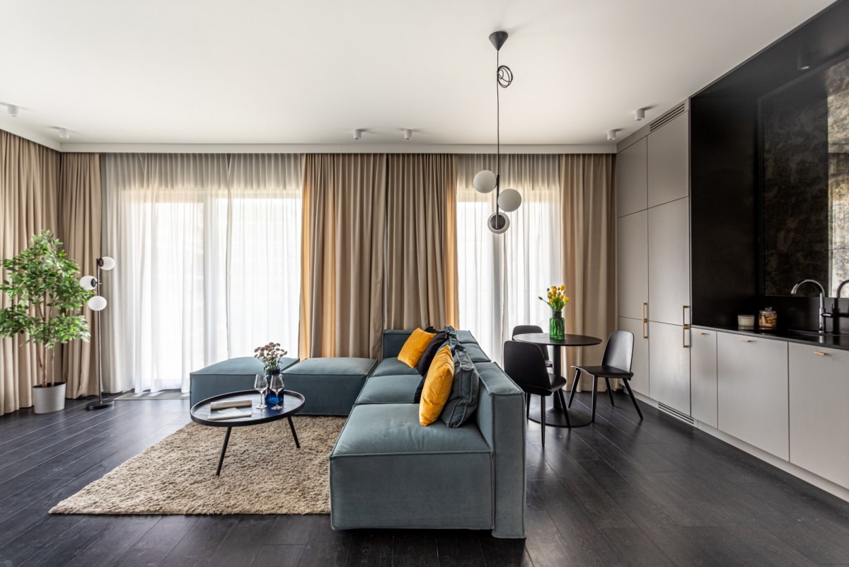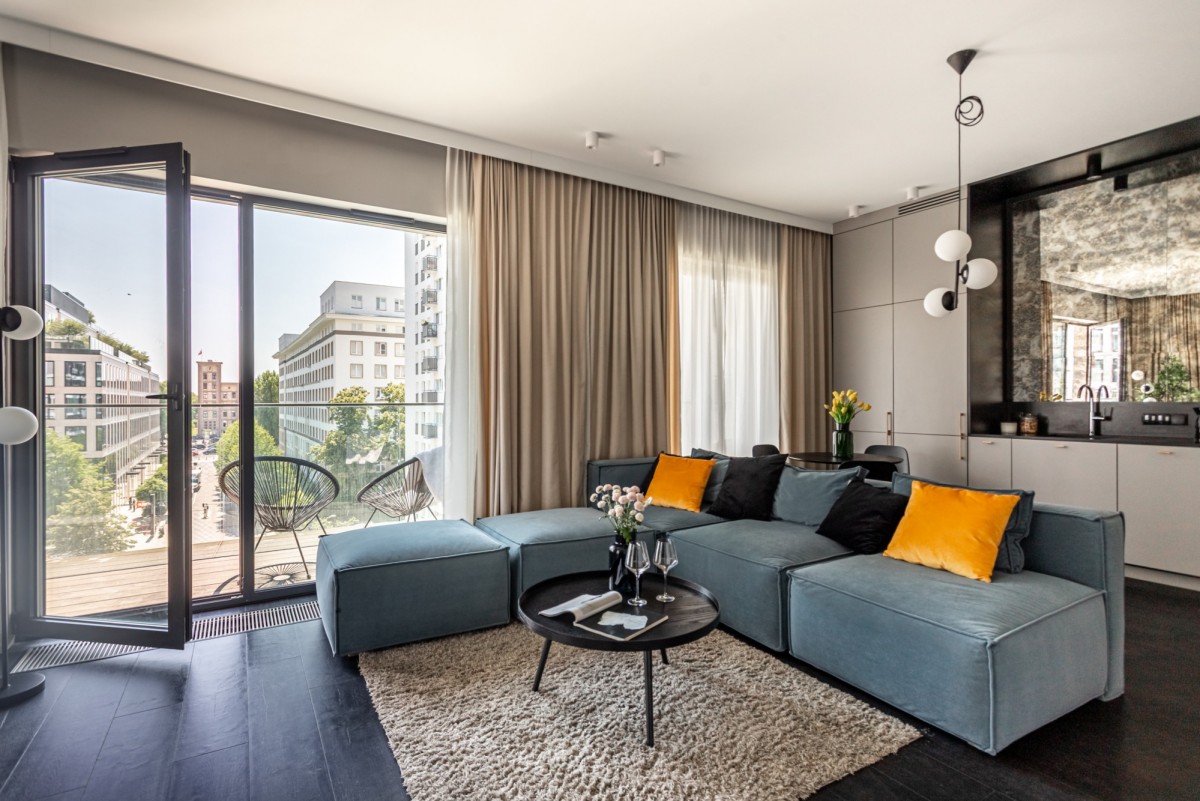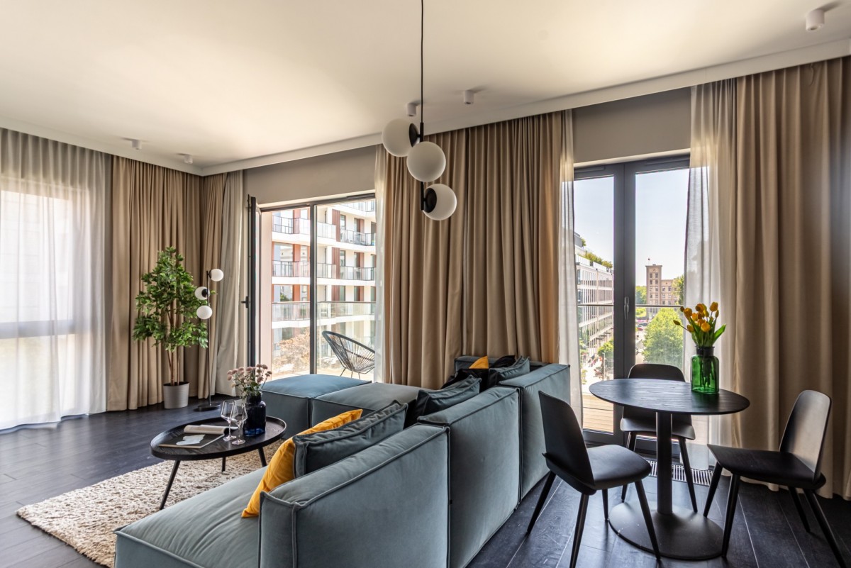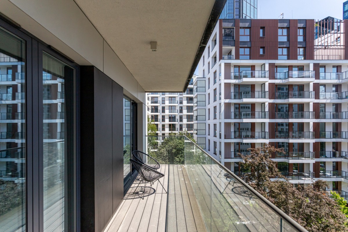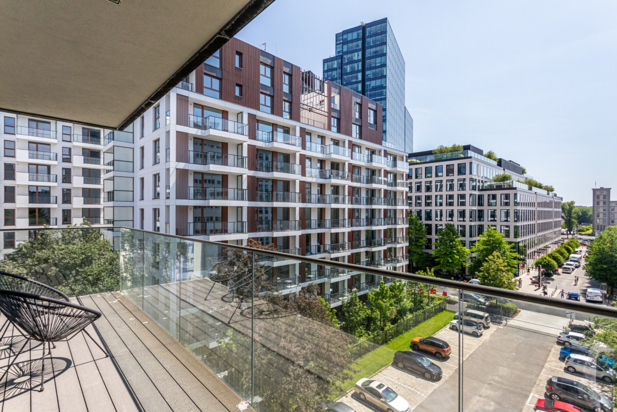 Wysokie sufity i duże okna o podwyższonym standardzie izolacyjnym, sprawiają, że mieszkanie jest jasne i daje wrażenie przestronności. Ponadto prezentowany apartament został wykończony przy użyciu wysokiej jakości materiałów oraz jest w pełni wyposażony i umeblowany. W mieszkaniu zainstalowano już jednostkę klimatyzacji. Dodatkowym atutem mieszkania jest balkon wychodzący na zieloną, cichą przestrzeń między budynkami.