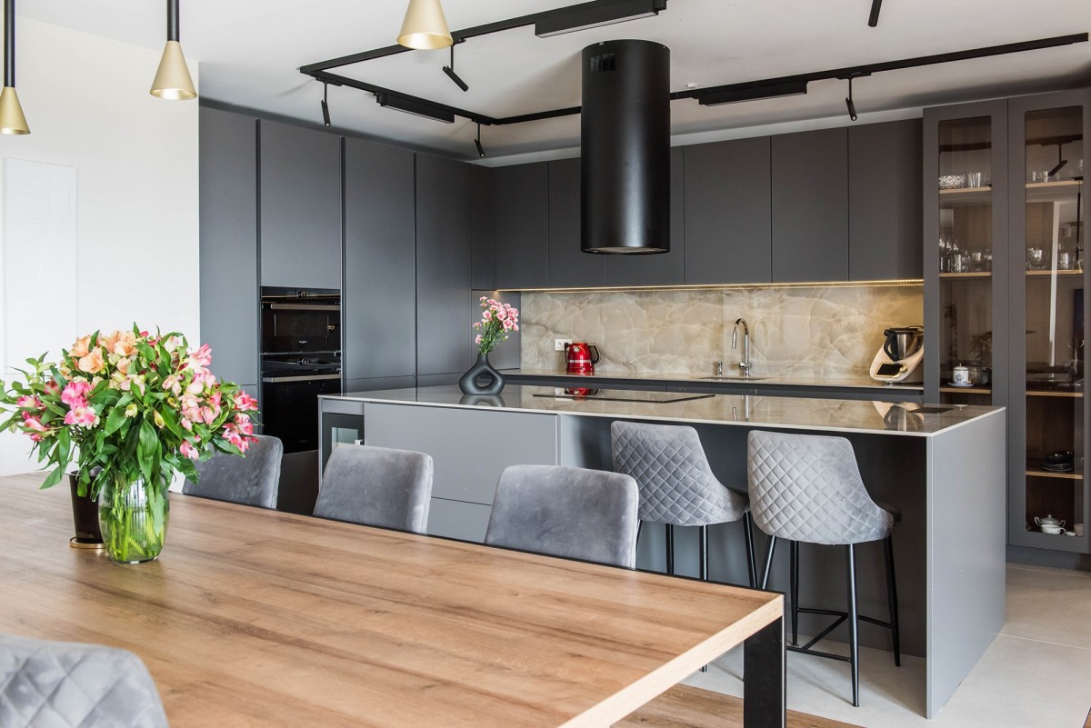 Kuchnia w pełni wyposażona w meble w zabudowie oraz sprzęty AGD: okap, piekarnik, kuchenkę, lodówkę, zmywarkę. Dodatkowo w kuchni znajdują się akcesoria takie jak talerze, garnki, sztućce.