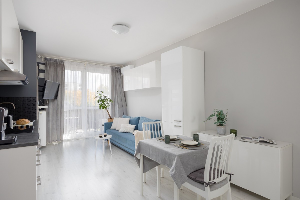 Mieszkanie jest funkcjonalne i dobrze doświetlone – ekspozycja południowo-wschodnia. W pełni wyposażone w meble i sprzęt AGD (w tym zmywarkę), posiada zainstalowaną klimatyzację, co zwiększa komfort użytkowania.