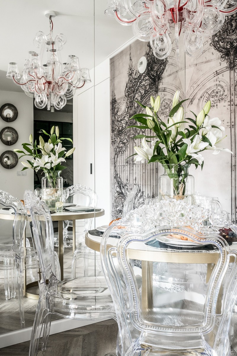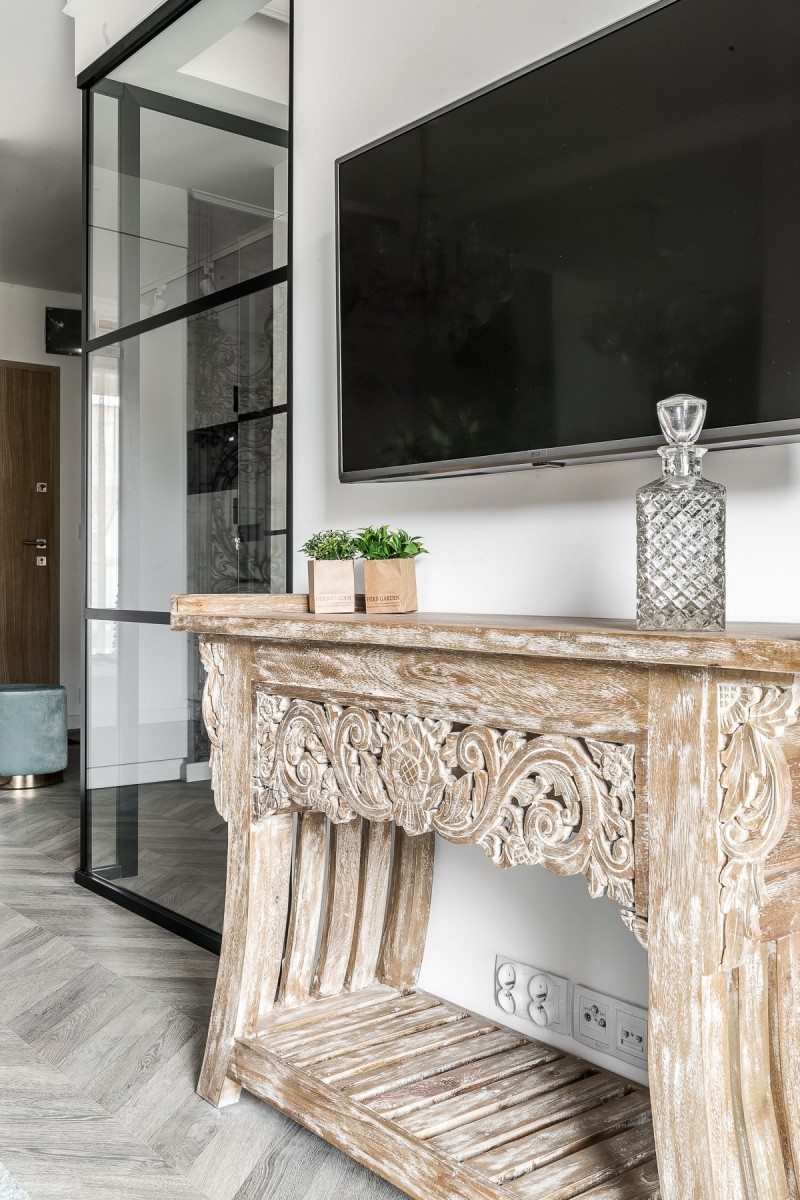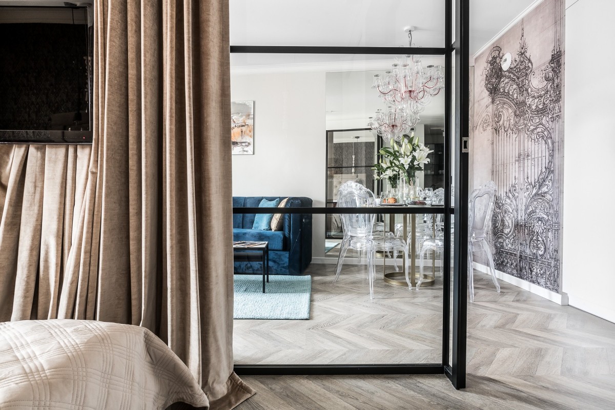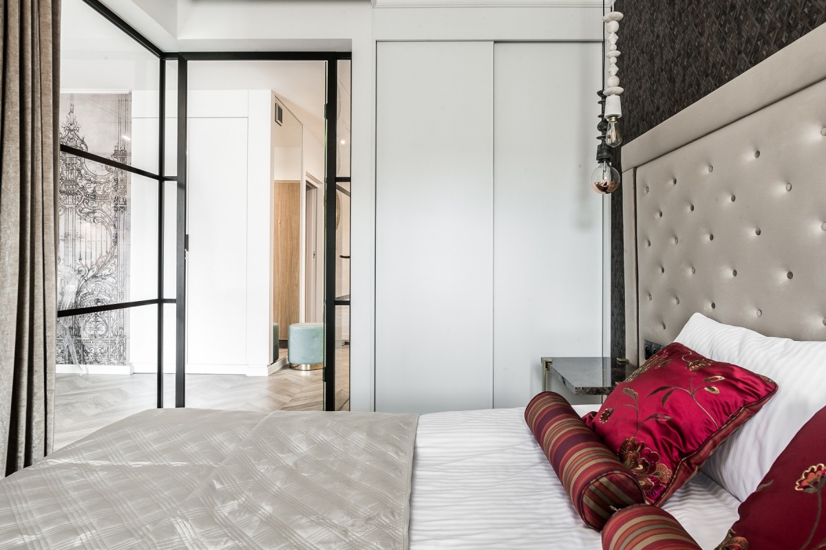 Apartament o wschodniej ekspozycji, zaprojektowany przez architekta łączy nowoczesną elegancję z elementami glamour i postindustrialnego stylu. Wnętrze wykończono szlachetnymi materiałami — aksamitem, szkłem i akcentami w odcieniach beżu, czerni, bieli, bordo i złota. Oryginalny charakter podkreślają dekoracyjne oświetlenie, szklane ściany oraz industrialne przeszklenia, które optycznie powiększają przestrzeń. Dodatkowo w apartamencie znajdują się pojemne zabudowane szafy zapewniające komfort przechowywania i wygodę na co dzień.