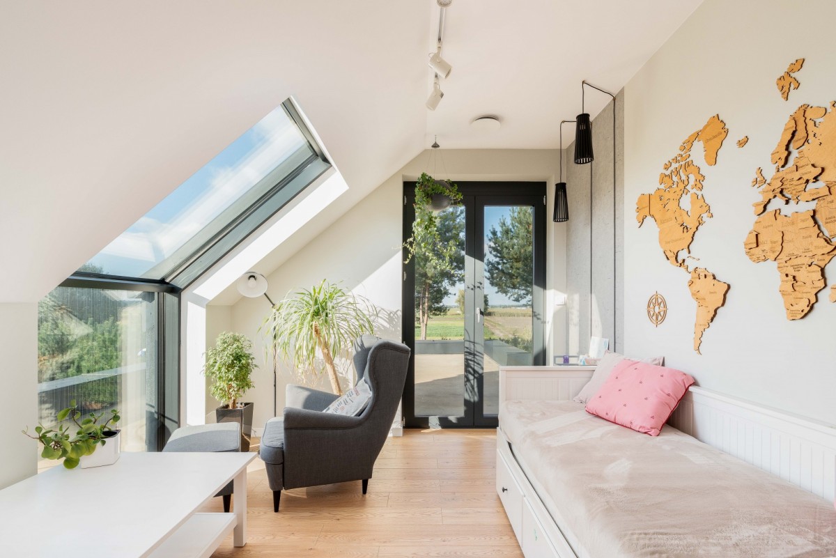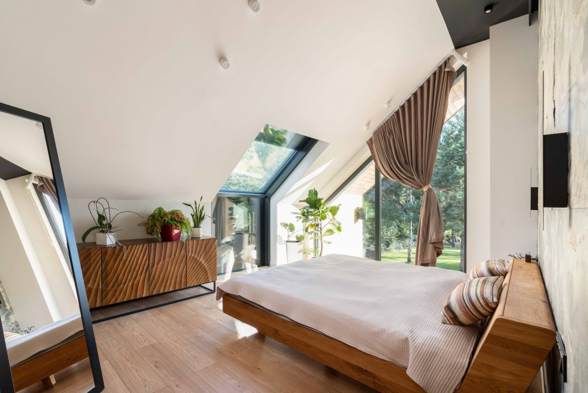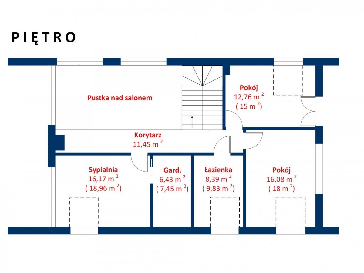 • PIĘTRO: 3 sypialnie (19, 18 i 15 m2); łazienka z wanną i WC; jedna sypialnia z wchodzoną garderobą (ok. 7 m2) i jedna z wyjściem na taras (ok. 30 m2);