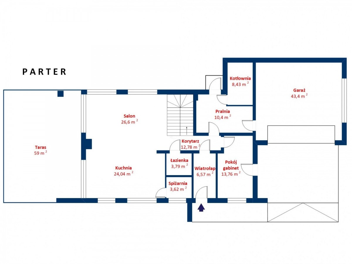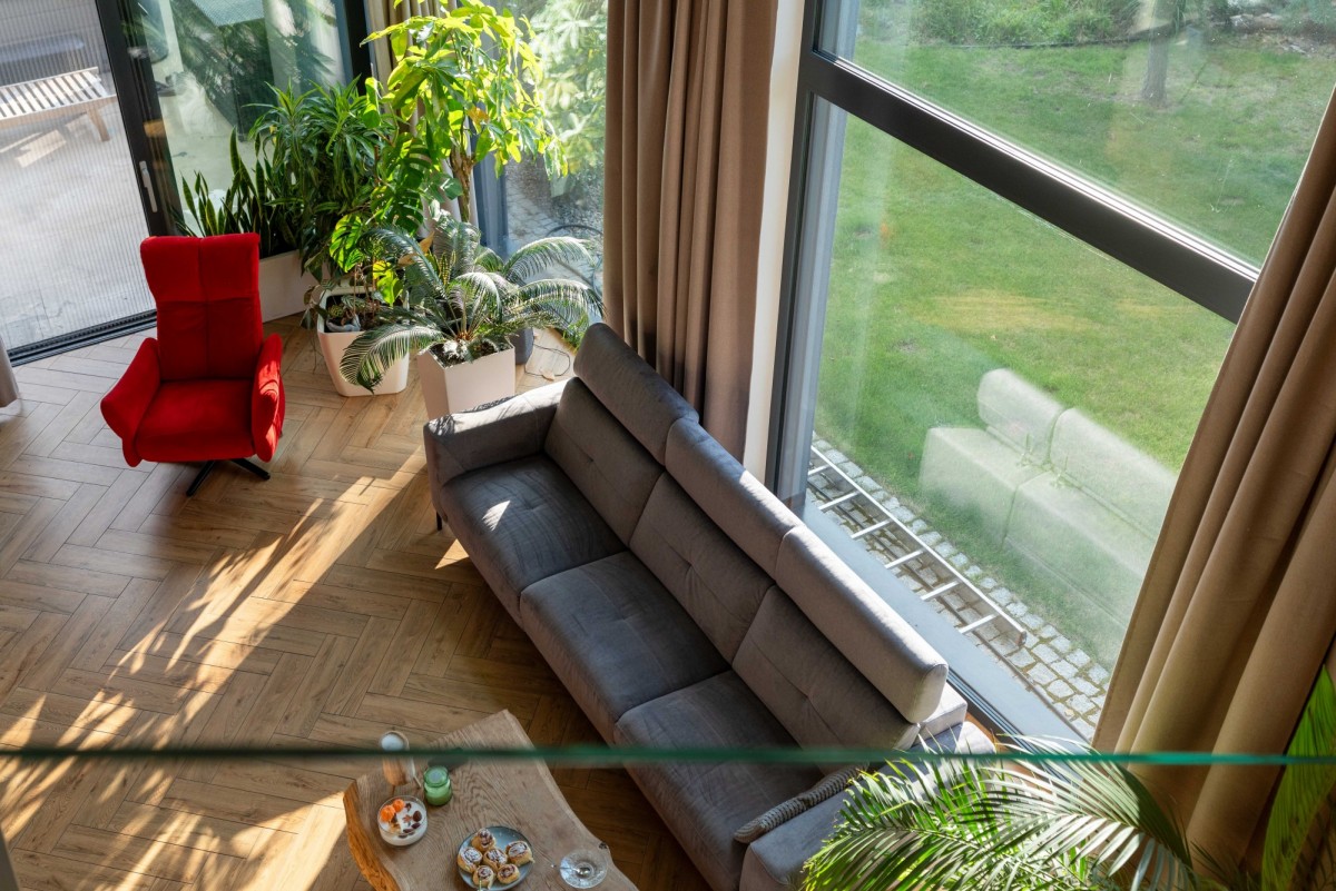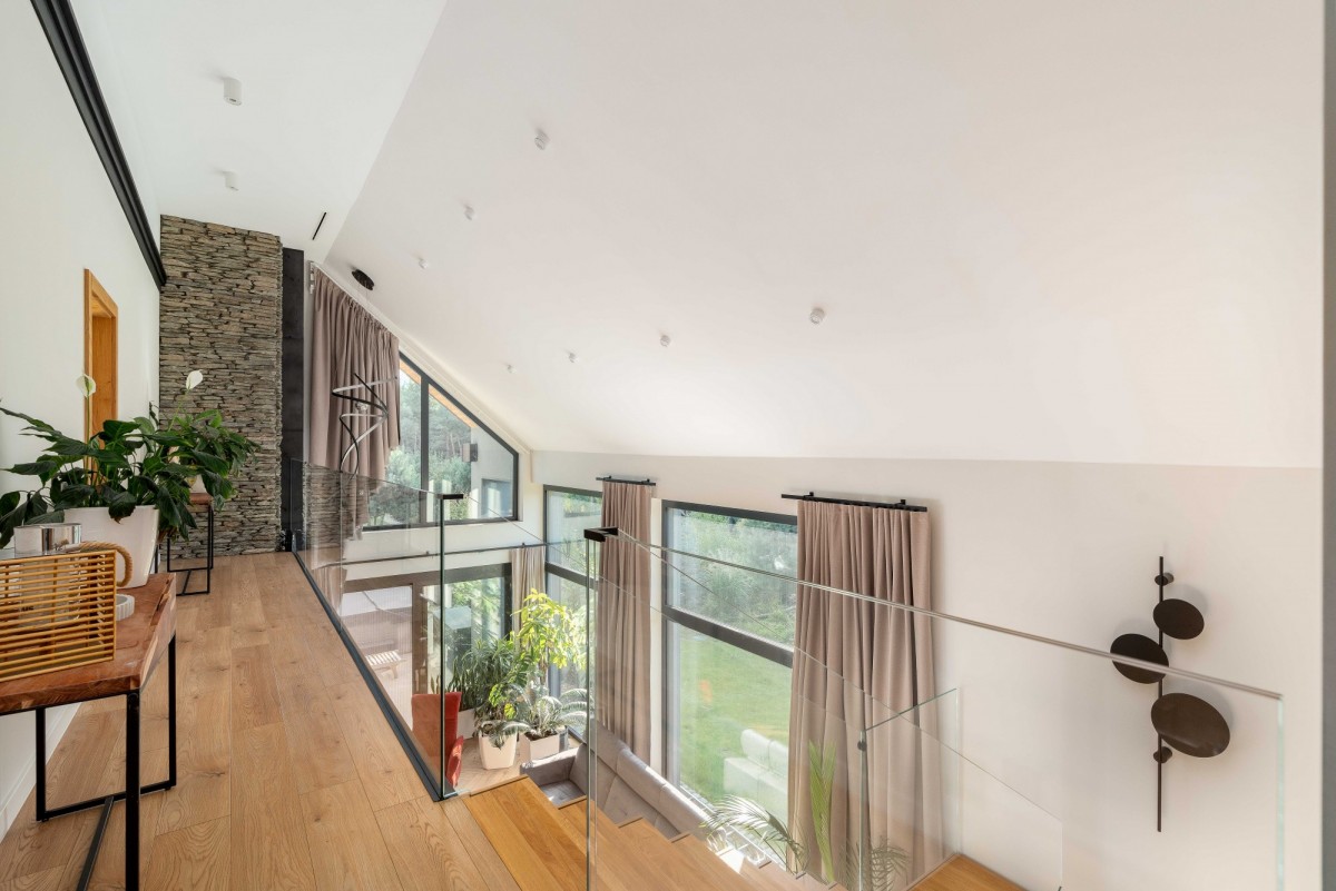 • PARTER: salon (ok. 27 m2, wysokość 9 m2) z antresolą i wyjściem na bardzo duży taras (ok. 60 m2); kuchnia z wyspą i spiżarnią (blaty granitowe); pokój gabinetowy (ok. 14 m2); łazienka z kabiną prysznicową i WC; pralnia z wyjściem na ogród; pomieszczenie techniczno-gospodarcze; korytarz z pojemnymi szafami w zabudowie;