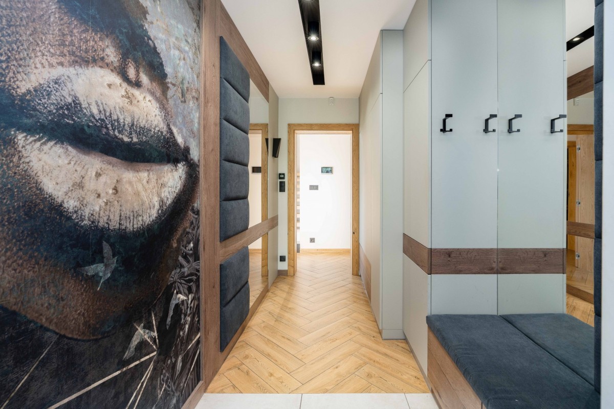 • na piętro prowadzą nowoczesne schody dębowe ze szklaną balustradą;