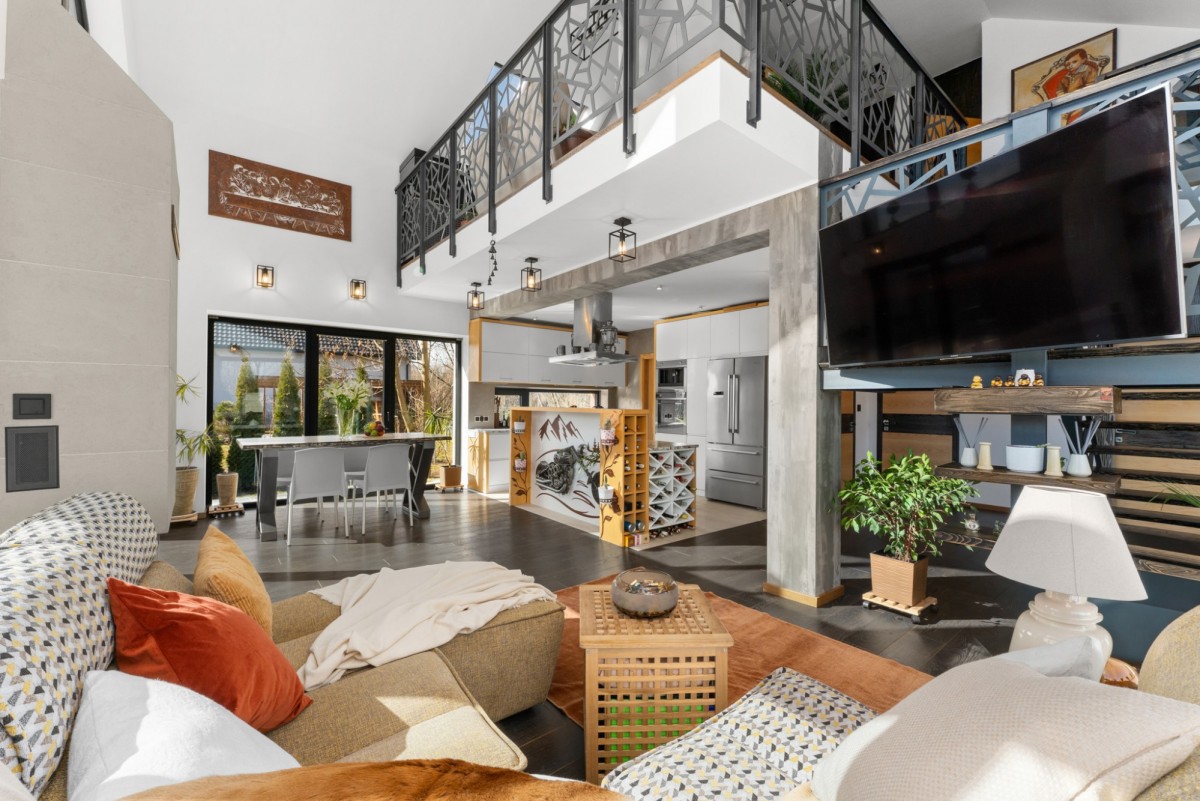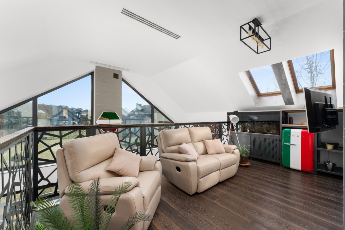 – antresola z widokiem na salon – z miejscem do pracy oraz do odpoczynku