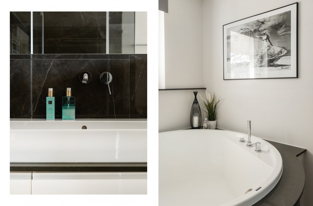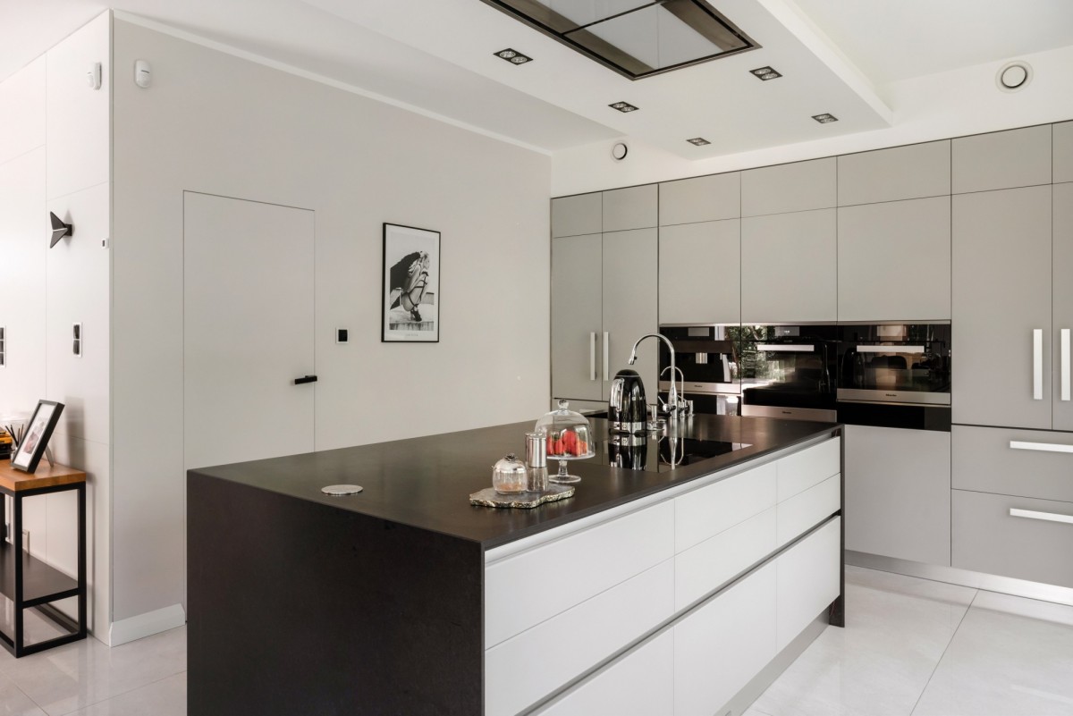 Wyposażenie obejmuje również AGD Miele (parownik, ekspres, piekarnik, płyta indukcyjna, zmywarka, lodówka side by side z kostkarką, pralka, suszarka), młynek na odpady oraz odkurzacz podszafkowy w wyspie kuchennej.