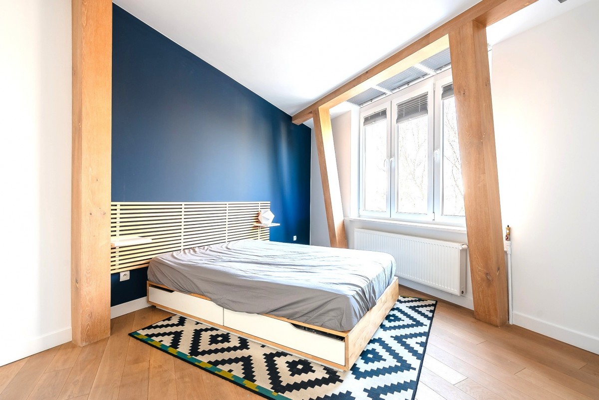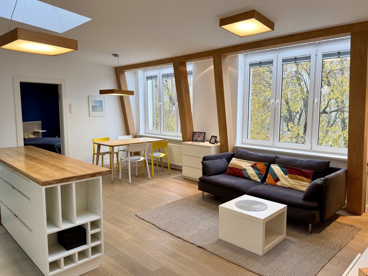 Projekt apartamentu wykonany przez architekta, obejmuje przestronne wejście i duże otwarte przestrzenie. Wysokość do sufitów i wykończenie drewnianymi belkami nośnymi dodaje mu lekkości.