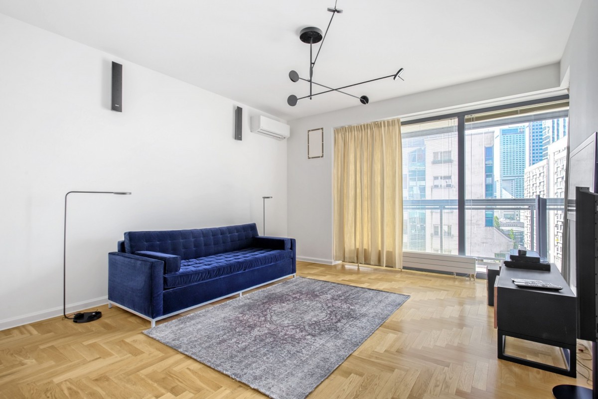 W kuchni zastosowano spieki kwarcowe, wysokiej klasy sprzęt AGD oraz zabudowę wykonaną na zamówienie. Na podłogach drewno naturalne. Apartament jest wyposażony w klimatyzację centralną.