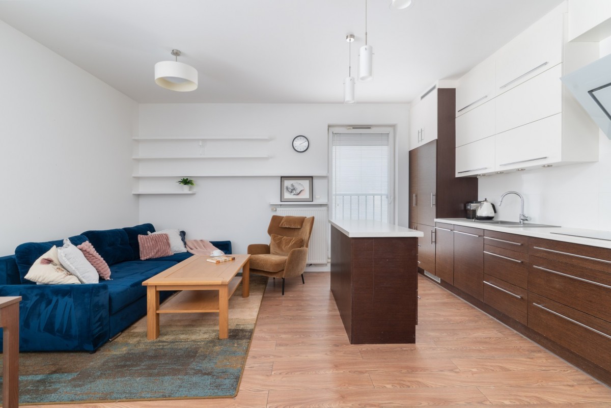Bardzo jasny salon z aneksem kuchennym i wyjściem na duży balkon.