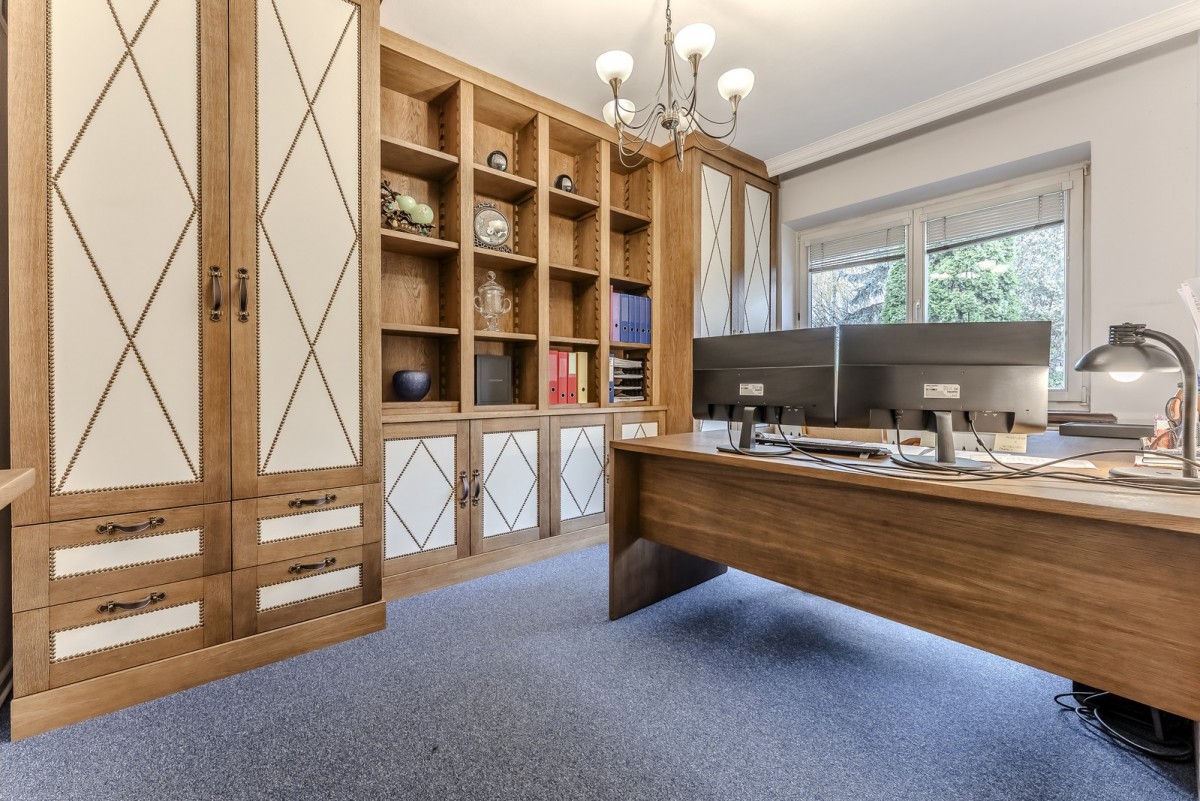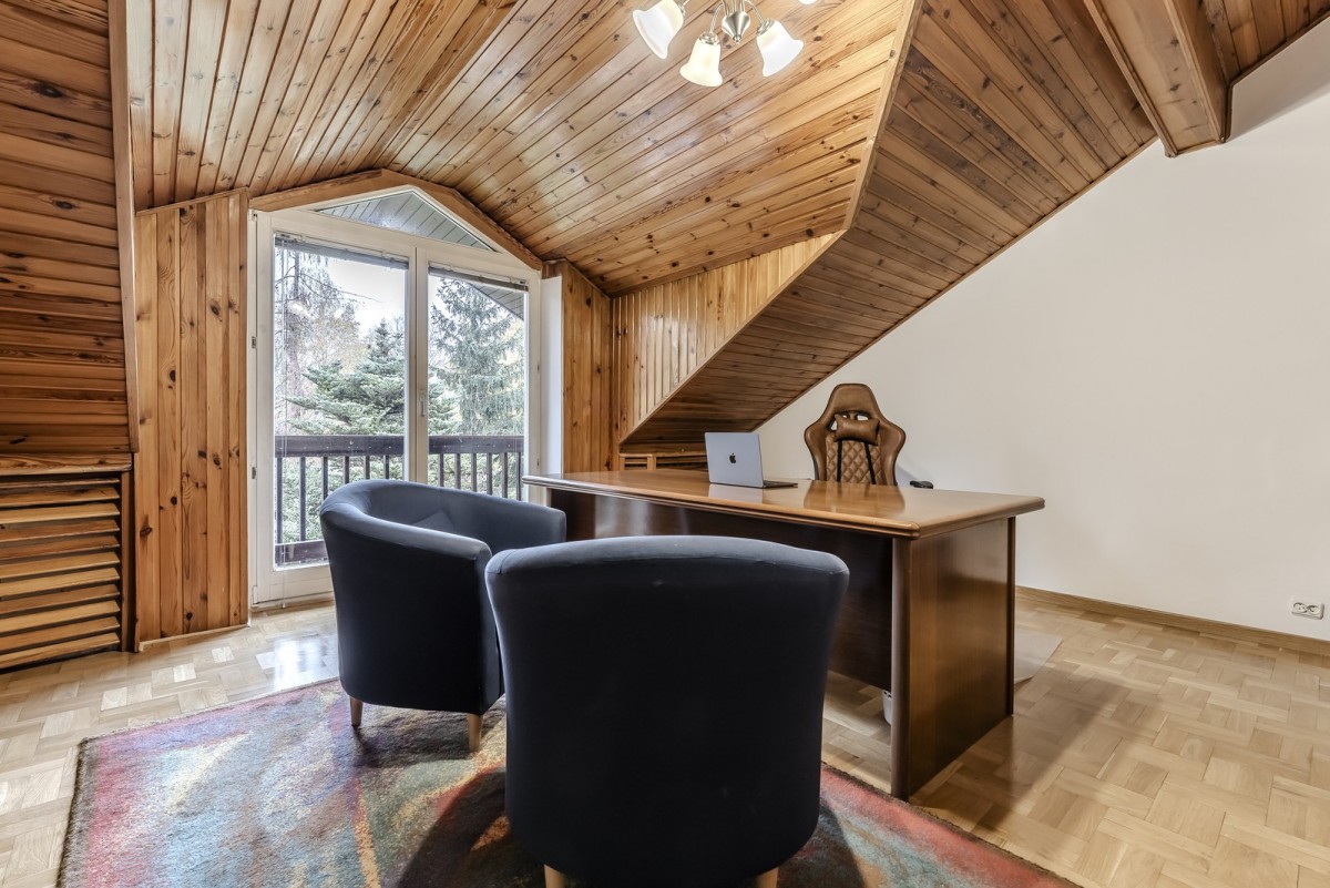 Nieruchomość jest w bardzo dobrym stanie technicznym – wymieniono instalacje elektryczne oraz wodne, co stanowi solidną bazę pod ewentualną aranżację. Klasyczne elementy wykończenia, takie jak drewniane podłogi oraz kominek w salonie, nadają wnętrzu ponadczasowego charakteru.