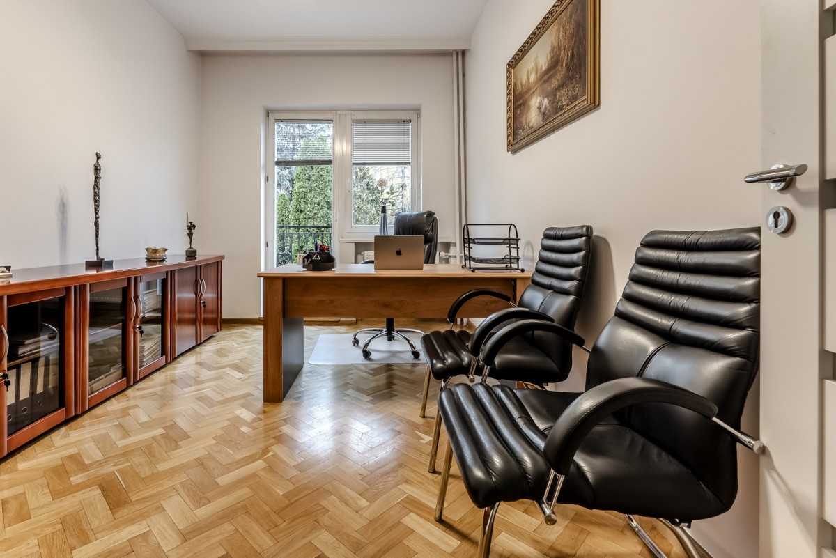 I Piętro: Reprezentacyjny salon z kominkiem i bezpośrednim wyjściem na taras oraz do zadbanego ogrodu, dwa dodatkowe pokoje oraz hol.