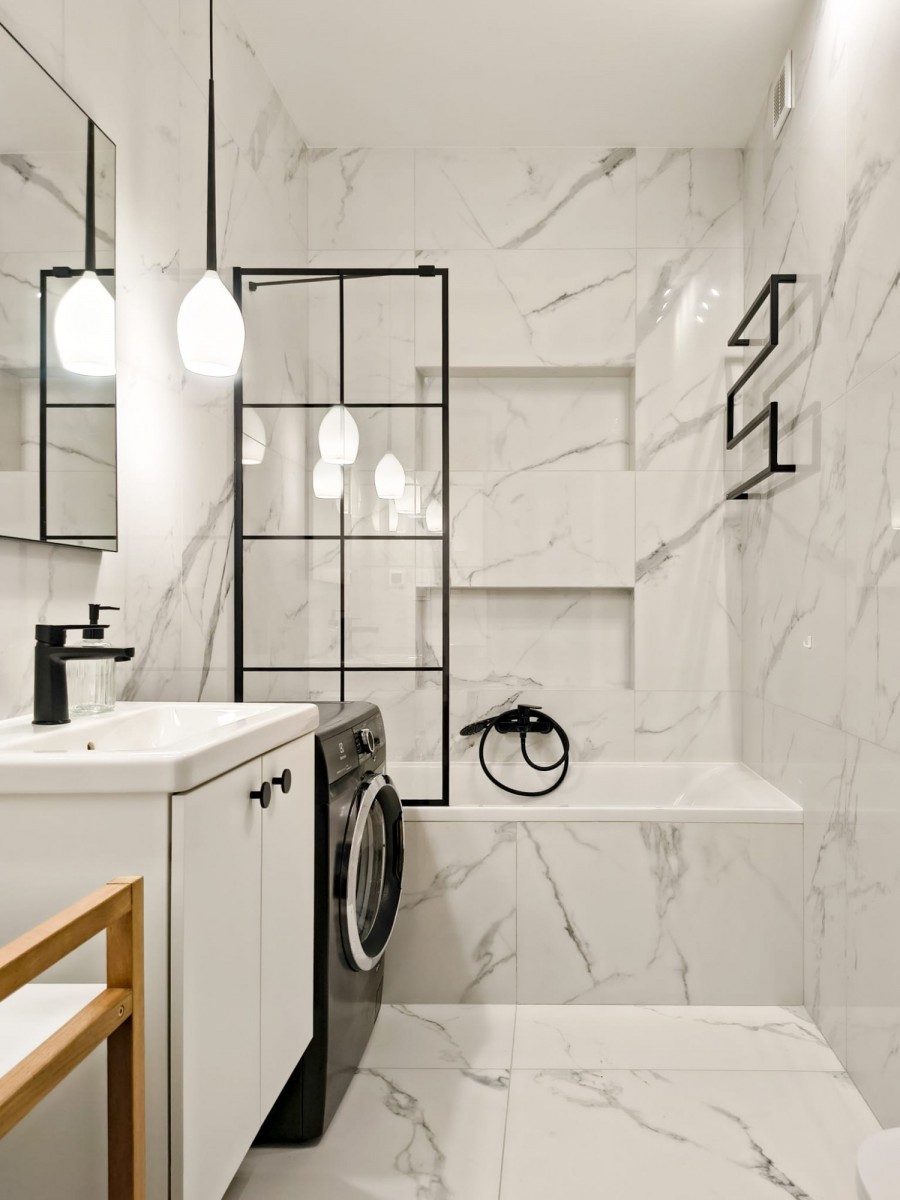 Łazienka: wykończona w wysokim standardzie, wyposażona w wannę, pralkę, WC.