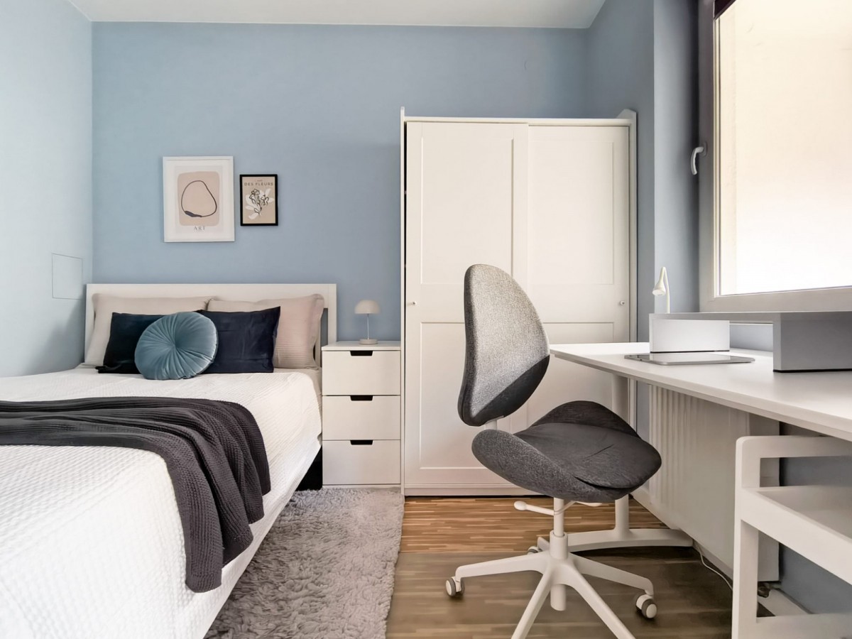 Sypialnia: oddzielna, z łóżkiem sypialnianym, szafą w zabudowie oraz stanowiskiem do pracy (biurko).