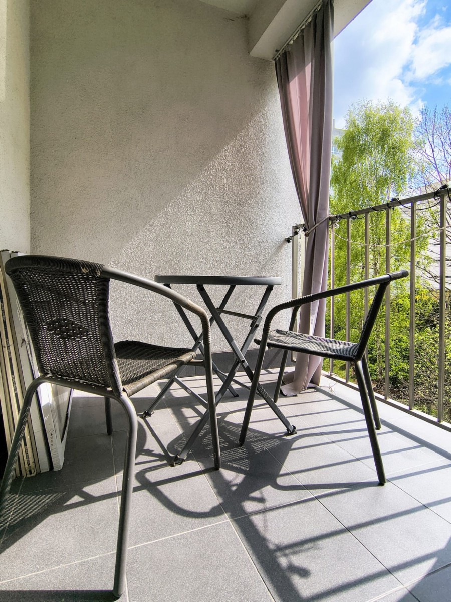 Balkon: miejsce na stolik kawowy, widok na wewnętrzną, zieloną część osiedla / miasto.