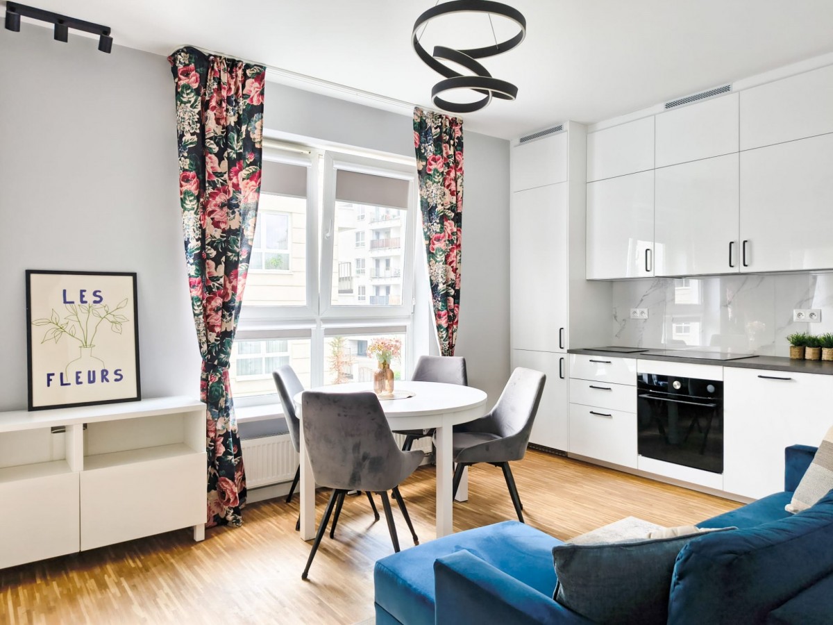 Salon z aneksem: jasny, z dużymi przeszkleniami, wyposażony w wysokiej klasy sprzęt AGD i wyjście na balkon.
