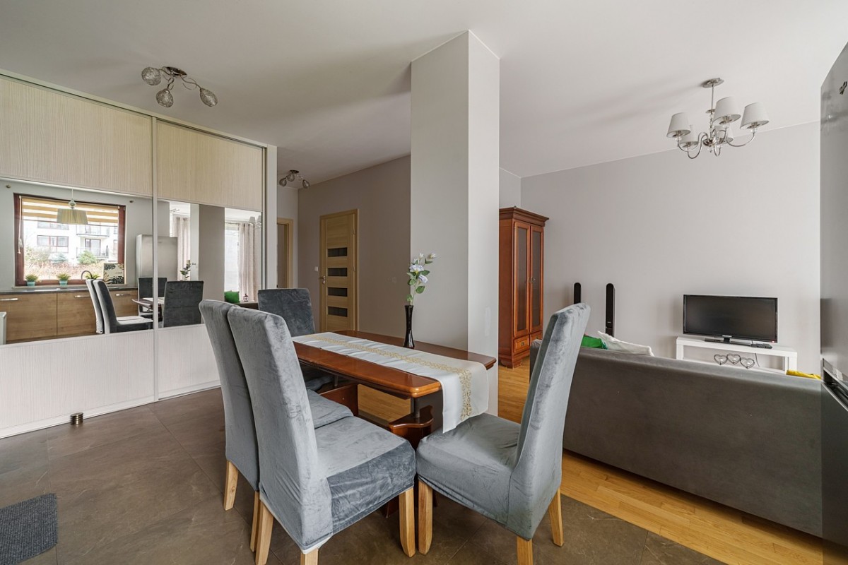Mieszkanie usytuowane jest na parterze zadbanego budynku z garażem podziemnym. Dwustronna ekspozycja wschód-zachód zapewnia doskonałe doświetlenie wnętrz przez cały dzień, a jednocześnie komfort termiczny — latem mieszkanie pozostaje przyjemnie chłodne, zimą ciepłe, dzięki dobrej izolacji i sąsiedniej zabudowie.