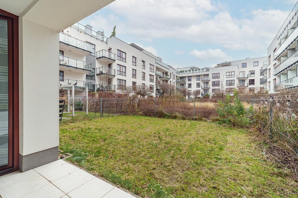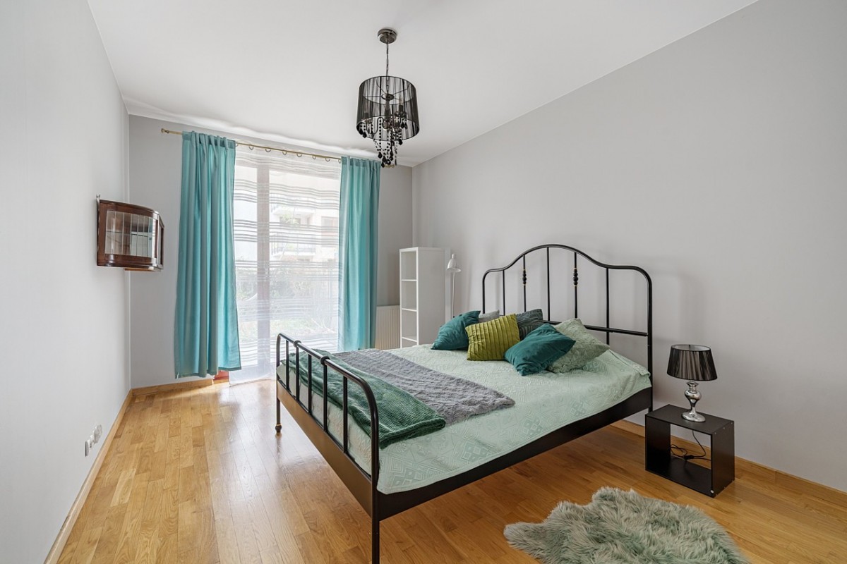 przestronna sypialnia (17 m²) z dużą szafą wnękową i wyjściem do kameralnego ogródka o powierzchni 14 m² — idealne miejsce na poranną kawę lub spokojny relaks,