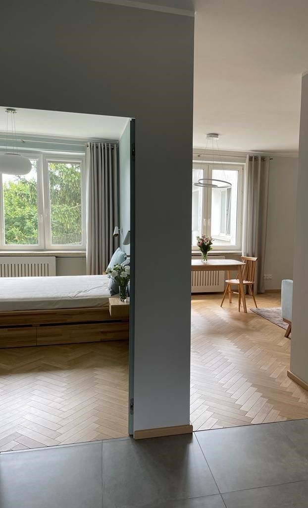 Mieszkanie dwustronne, z dużymi oknami z widokami na zieleń drzew.
