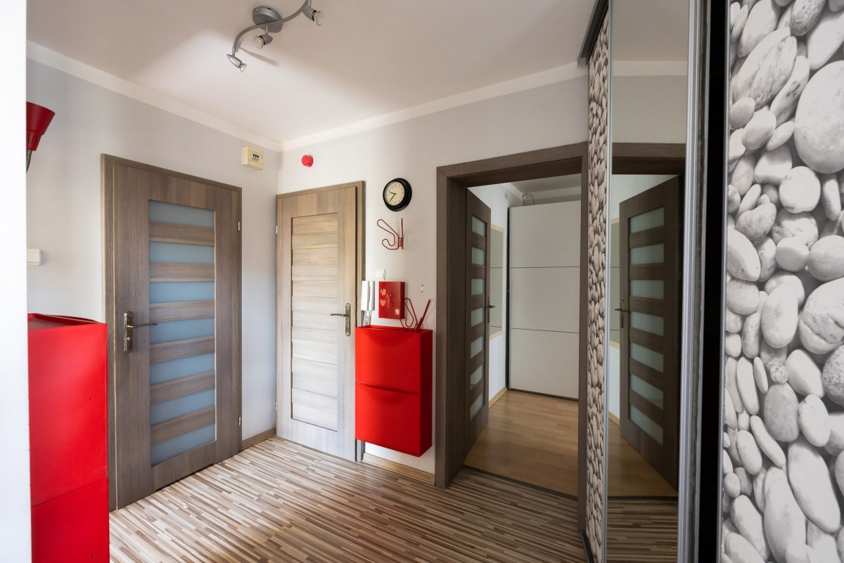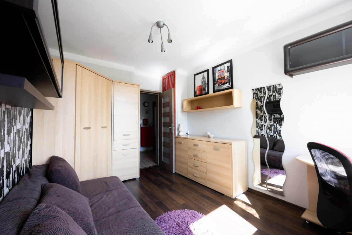 Mieszkanie jest zadbane, umeblowane i gotowe do wprowadzenia bez dodatkowych nakładów. Na podłogach panele/płytki, plastikowe okna, drzwi antywłamaniowe. Duża ilość szaf w zabudowie pozwala wygodnie przechowywać rzeczy. Zadbana klatka schodowa, spokojne sąsiedztwo.