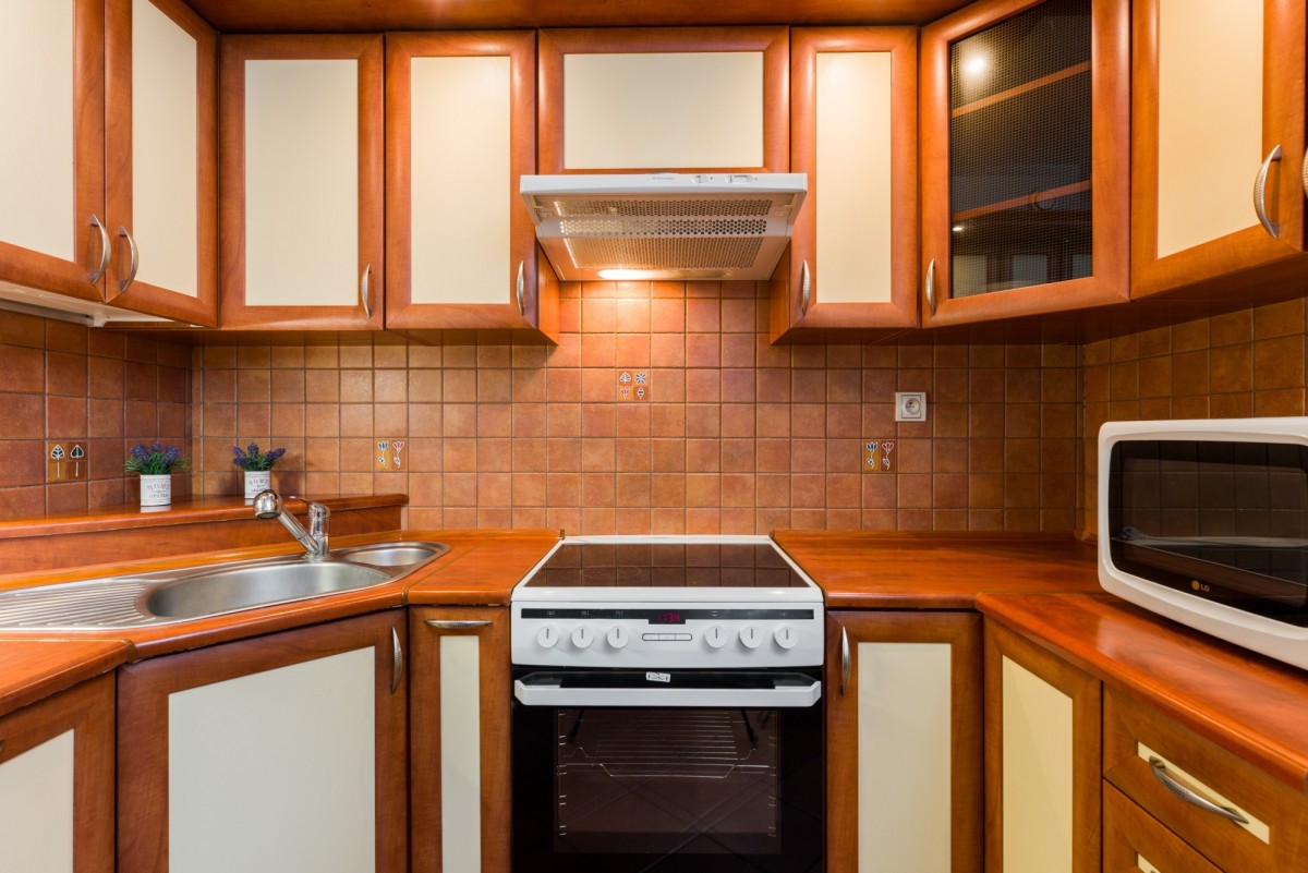 * Kuchnia stanowi osobne pomieszczenie i jest w pełni wyposażona w niezbędny sprzęt AGD, w tym lodówkę z zamrażarką, piekarnik, płytę grzewczą oraz zmywarkę.