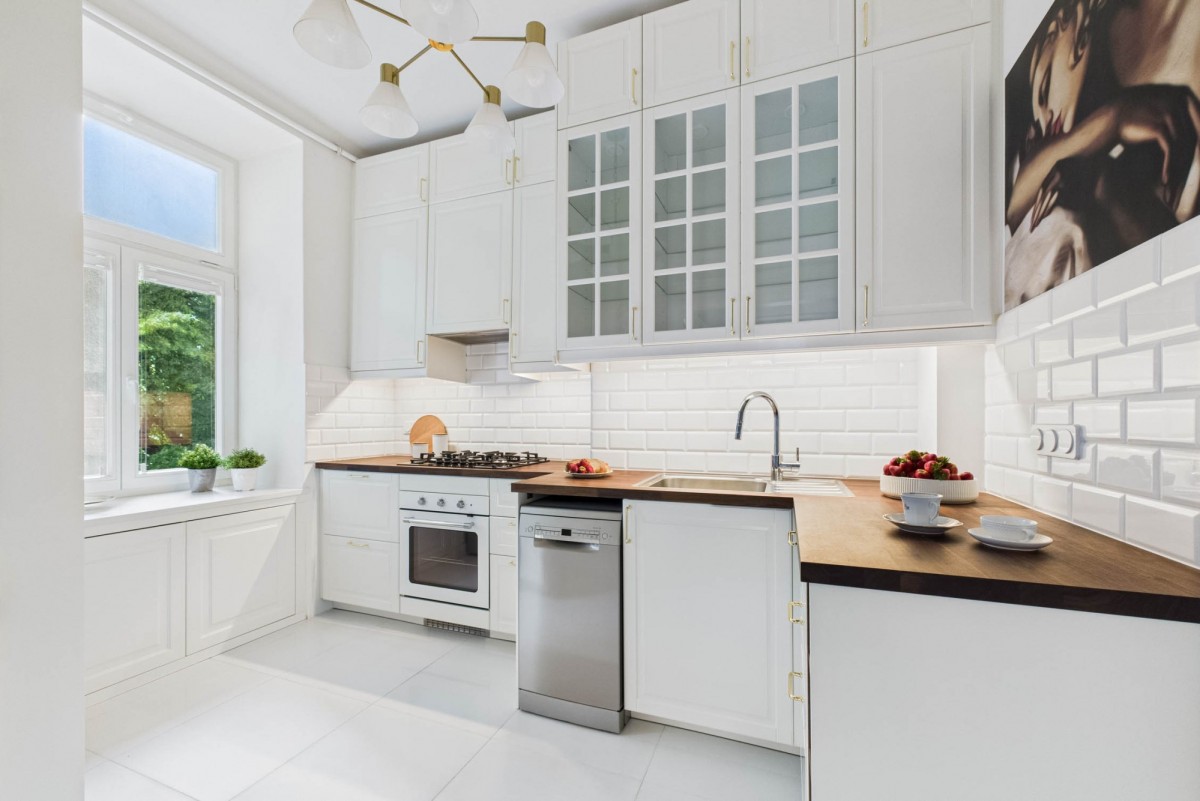 • Kuchnia z oknem: zabudowa na wymiar, kuchenka gazowa, piekarnik, zmywarka i… Tamara Łempicka na ścianie. Zachowana również oryginalna „zimna szafka” – idealna na domowe przetwory.
