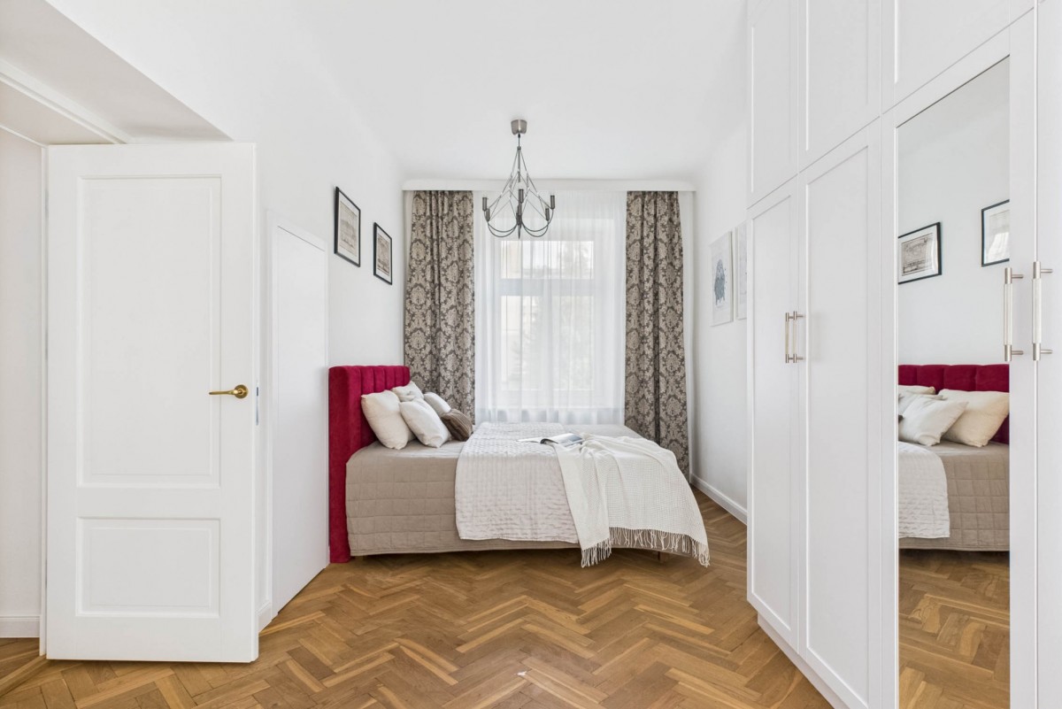 The living room and bedroom feature restored, oiled original pre-war parquet floors. The interior ambiance is highlighted by brand-new wooden window and door joinery, ceiling mouldings, and elegant brass handles.