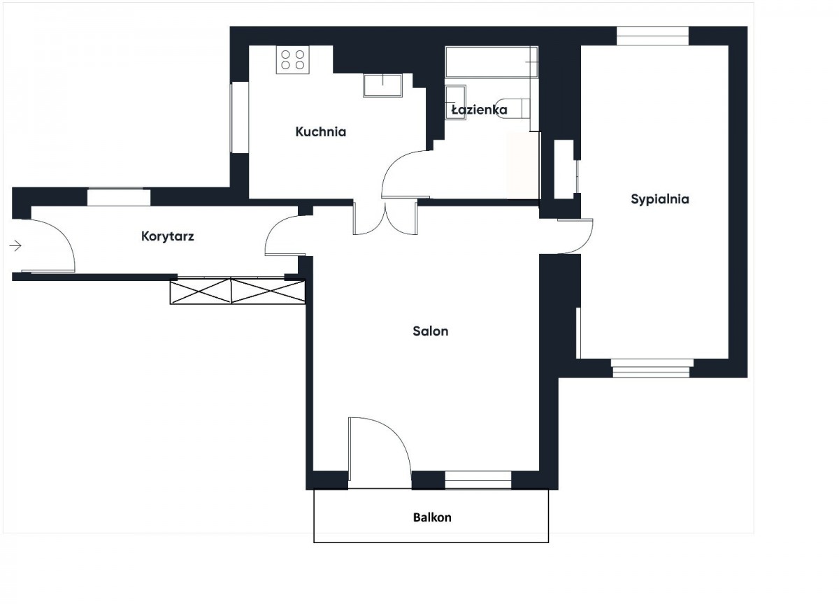 • Sypialnia z dwoma oknami na przeciwległych ścianach: pojemne szafy, łóżko 180 cm z dużym pojemnikiem, miejsce na biurko lub łóżeczko dziecięce. Możliwość łatwego wydzielenia dwóch niezależnych pokoi.