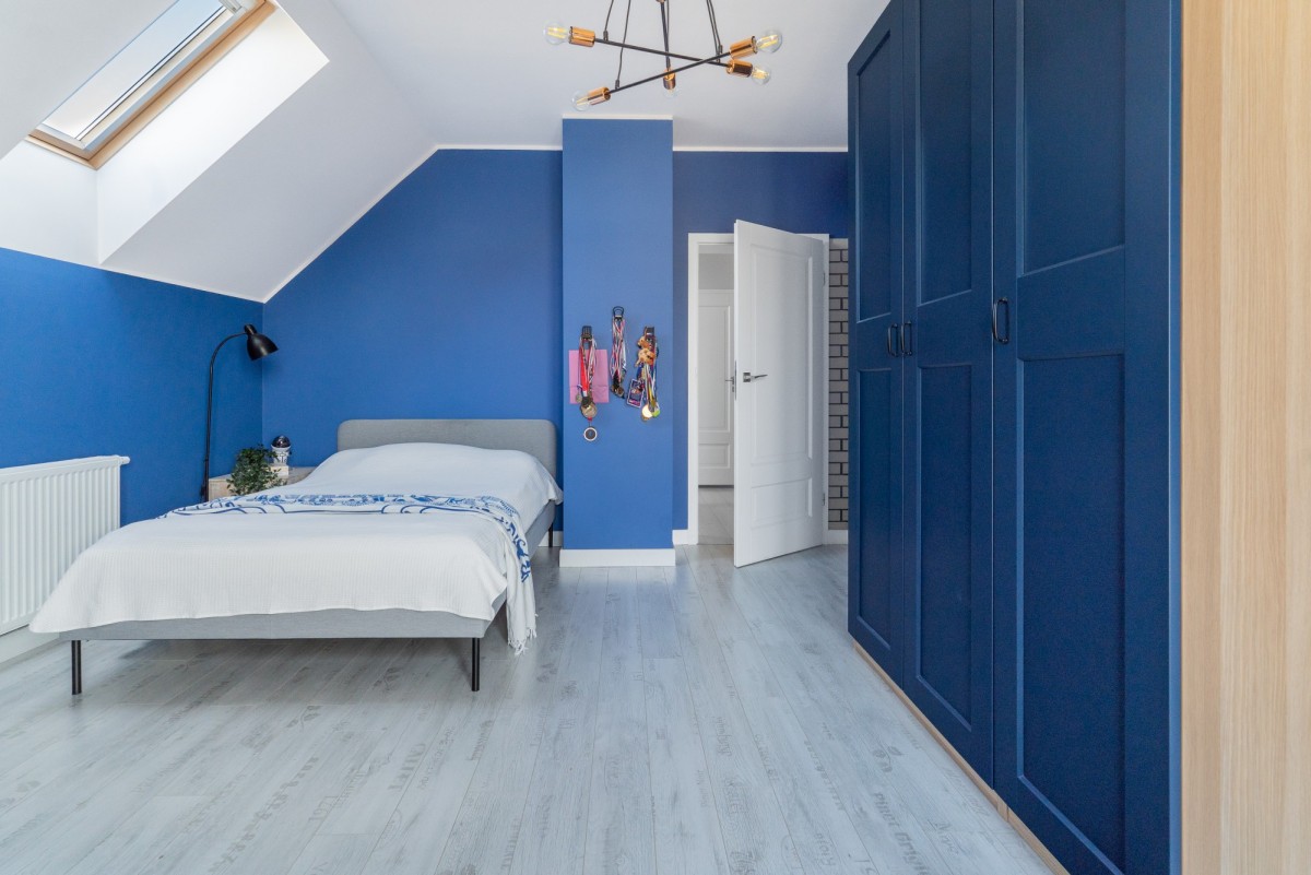 Dom główny (218 m²) to przemyślana przestrzeń rodzinna. Na parterze znajduje się salon z aneksem kuchennym i spiżarnią, jadalnia w wykuszu oraz łazienka z prysznicem i pralnia. Piętro mieści trzy ustawne sypialnie, łazienkę z wanną oraz wielofunkcyjny pokój nad garażem, który sprawdzi się jako siłownia, sala gier lub domowe biuro.