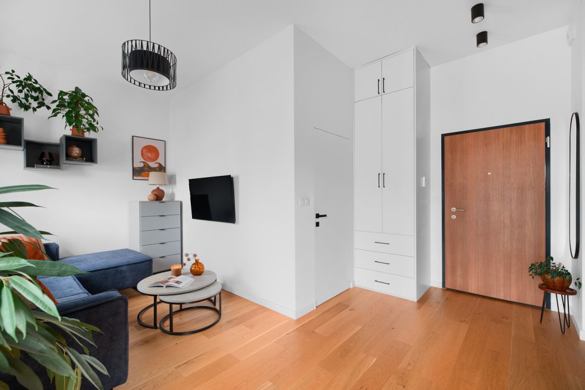 Na podłodze położona jest deska barlinecka. Zabudowa meblowa wykonana została na wymiar.